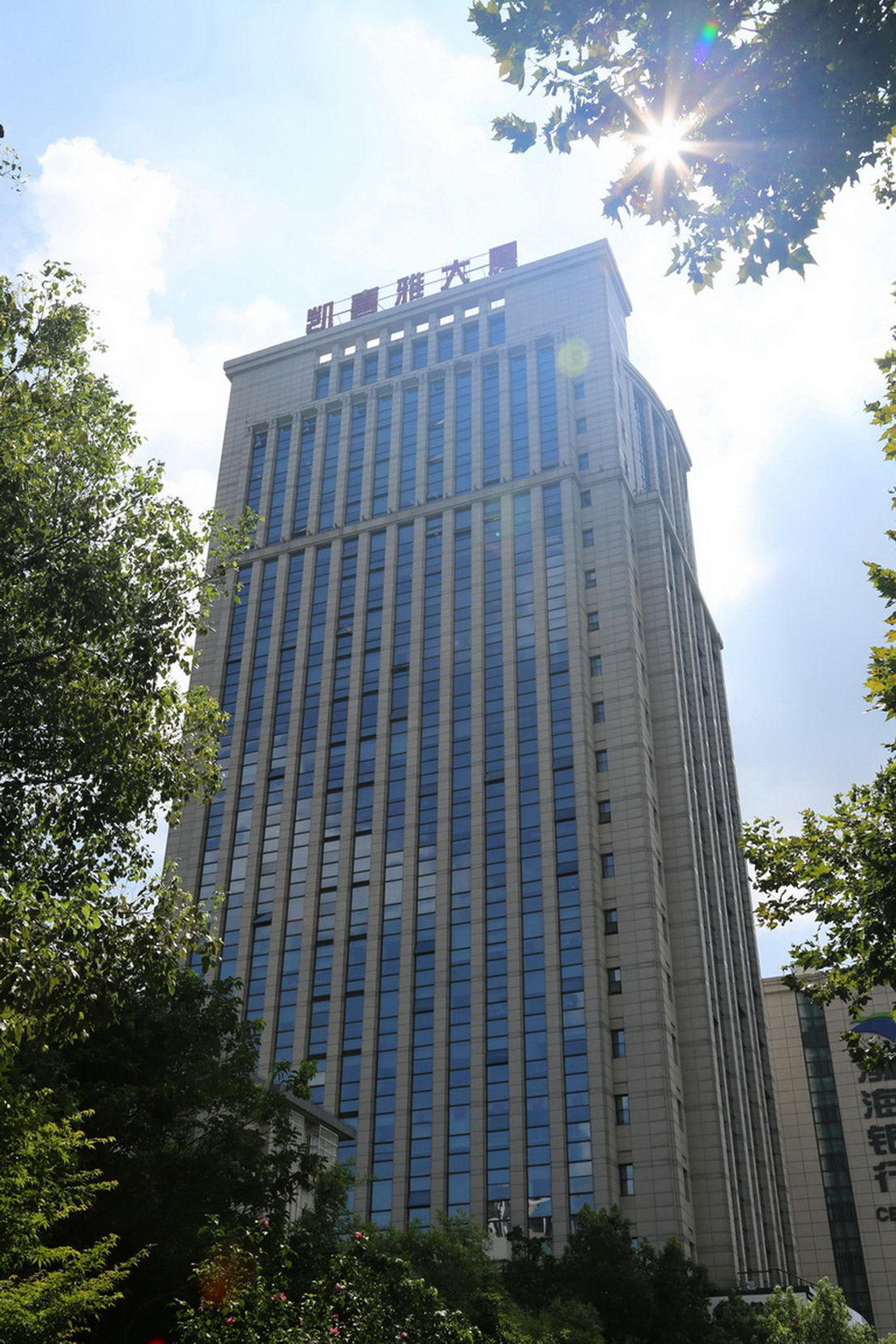 按本工程的地理位置,沿体育场路为建筑物的主导立面。设计中力求体现现代商务写字楼建筑庄重、典雅的风格;充分展示建筑物的时代特征。立面采取经典的三段划分手法,其基座部分为花岗石饰面的实体墙面,有坚实的基座感。而建筑顶部则为用幕墙玻璃装饰的,错落有致的方柱体,凸现了现代建筑的个性。建筑物的东立面采用了强烈的竖线条,表现了强劲的造型力度。东立面的基座中部设有巨幅圆型门窗,配以新颖、轻型的玻璃雨蓬,再与花岗石饰面的基座相对比,更加丰富了基座部分的虚实辉映,增添了建筑的光影效果。建筑色彩保持米灰基调,间以白色线条,使整个建筑形象生动和壮观。