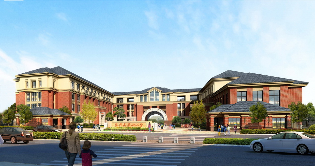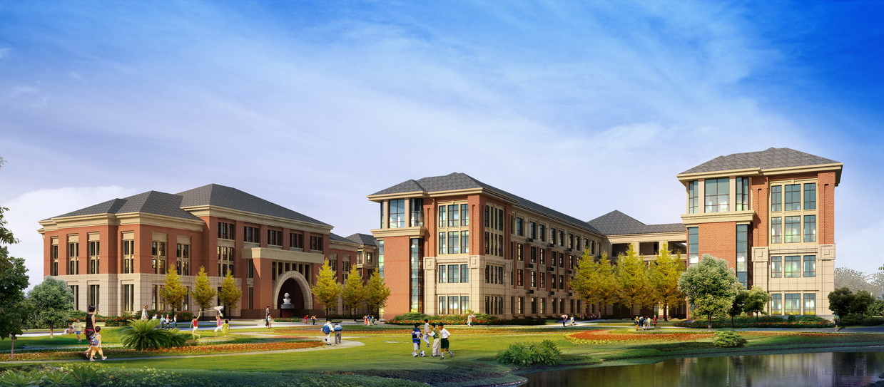 项目位于浙江省湖州市长兴县经济开发区内,东临经三路,南邻迎宾大道,地理位置优越,交通便利。基地周围配套设施基础条件较好。北面紧邻城市水系,自然环境条件极佳。 项目总平设计重点是满足学校建筑的学习交流功能要求,通过开放空间,半开放空间,安静空间来达到不同功能的要求。我们将主要出入口与迎宾大道相连,主入口结合绿地与入口广场,典雅而壮观;学生、教师到达教学楼方便快捷。不同的院落作为基本的单元承载着不同的功能,为人们提供了不同的空间感受,次入口东接经三路。学校区块东南侧设置300米标准操场和体育活动场地。校区内以步行为主,并考虑无障碍设计。建筑单体追求适度、质朴、品质、意境的根本设计原则。我们选择了主体为简约的现代建筑风格。同时在色彩、材料对比和一些传统符号的应用上力图表现传统精神和地域特征。当然为弘扬传统文化也在寻求一种中国原始的精神动力与学校的自身特质的交汇点。各单体通过室外通廊连成一个整体,相互咬合,形成校园中心广场及内部庭院。
